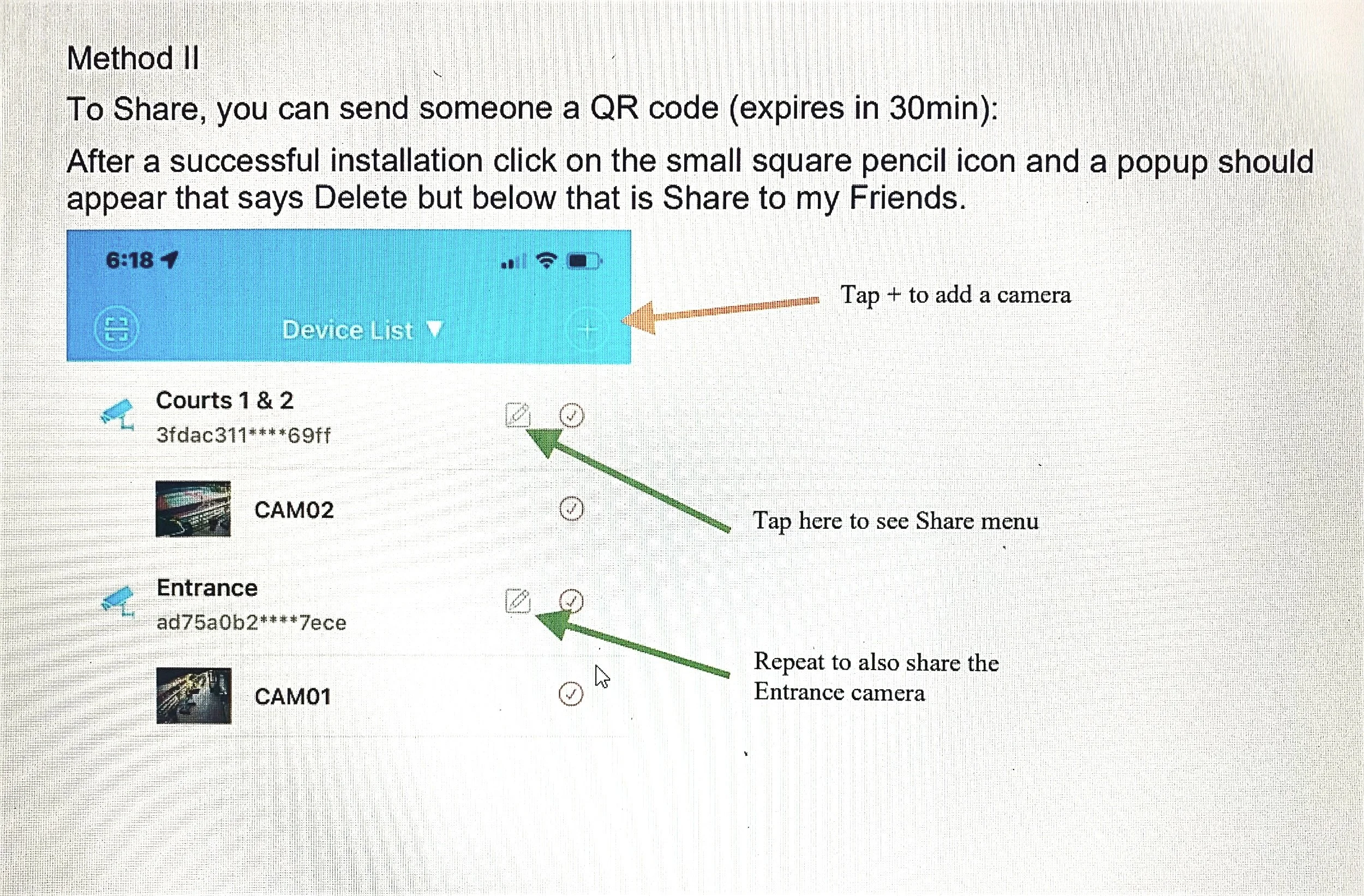 Method I: After installing XMeye app login with sdtc1414 and password sdtc7539; dismiss the black popup if it appears. In the lower left, tap on the Device icon. On the Device List, tap + in upper right (orange arrow and choose Manual Add Enter a device name (anything) and the Serial numbers below.